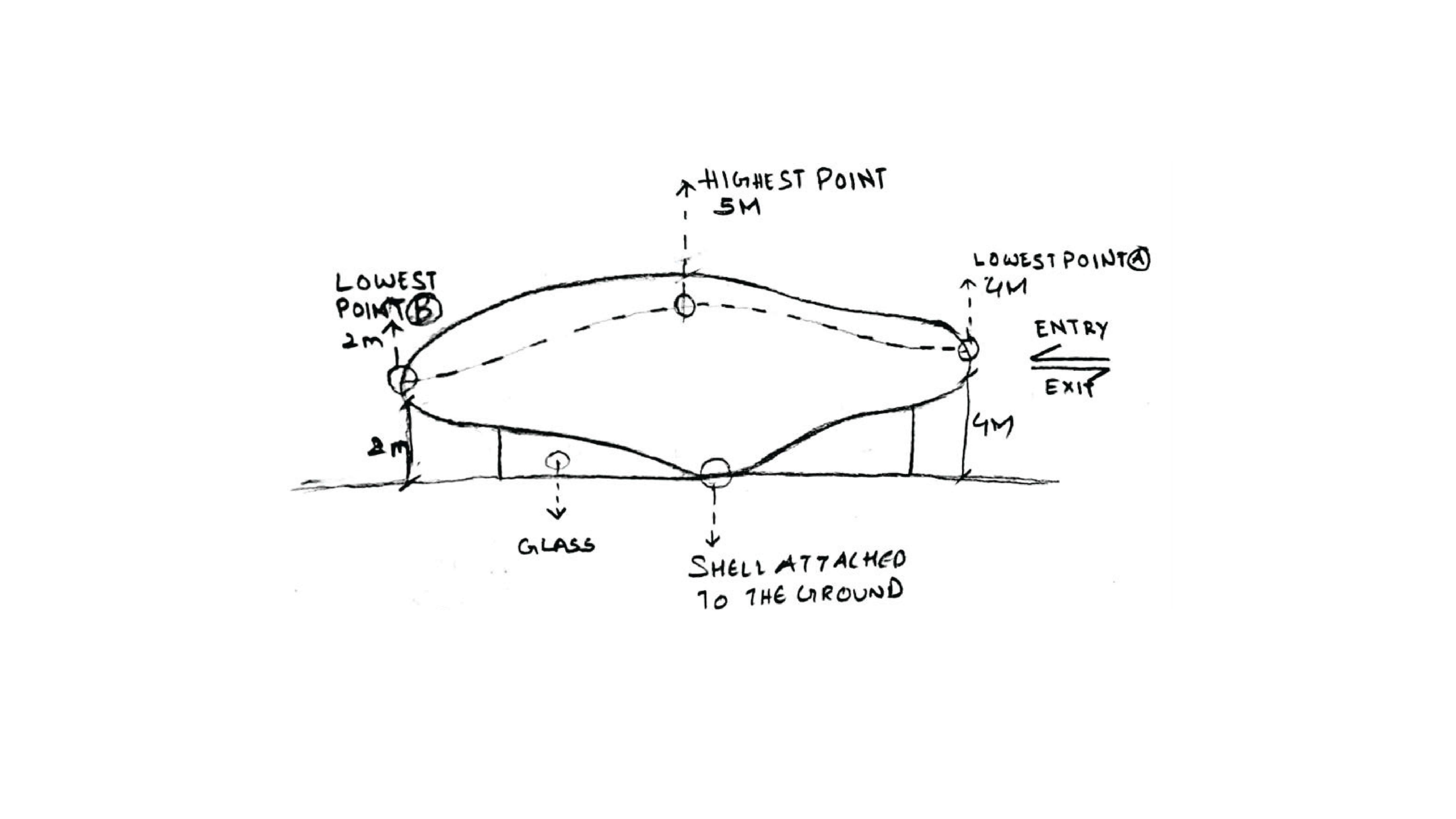 The exterior structure is inspired by a distorted shell, embodying organic fluidity. The side elevations and top-down plan provide a clearer understanding of the design, with key elements highlighted: