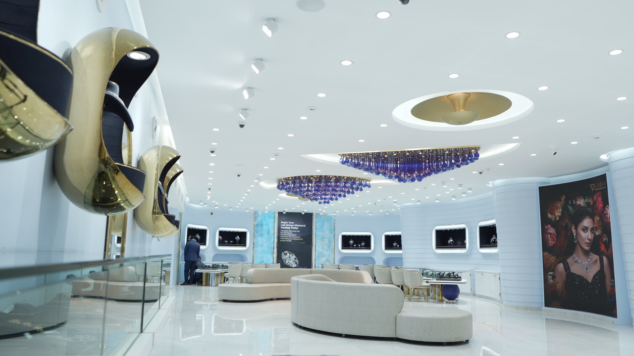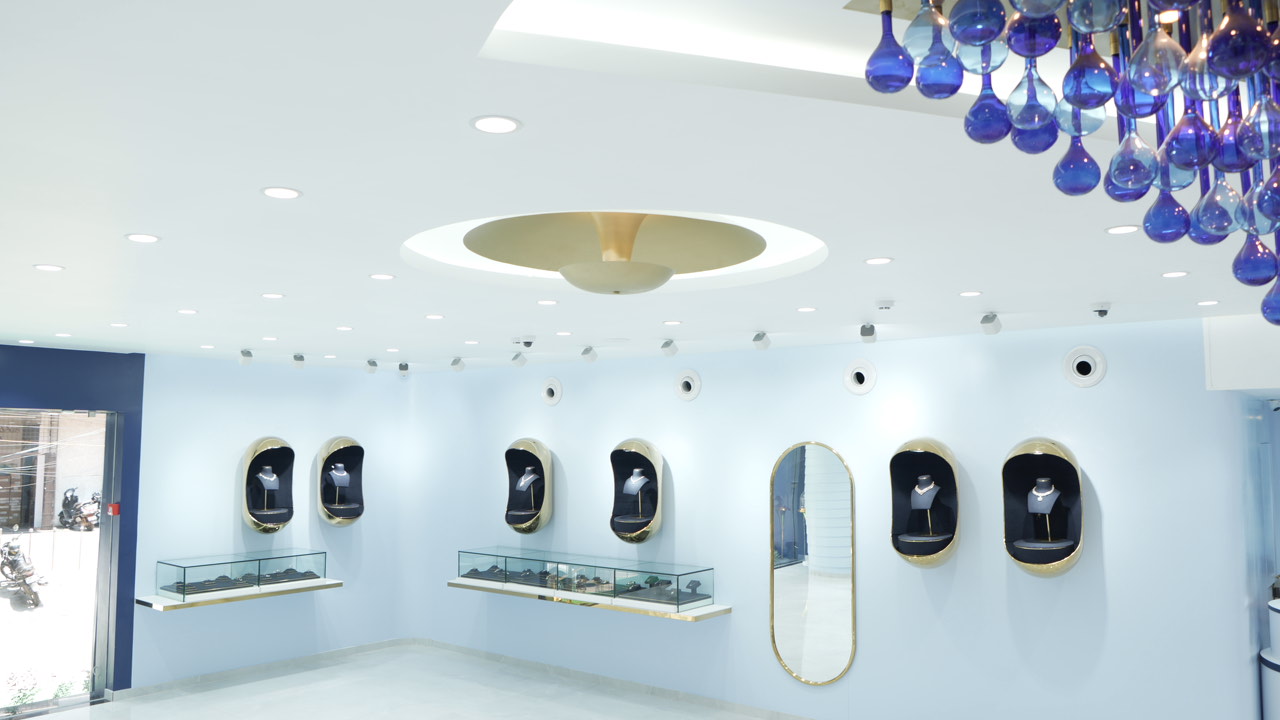 This lab-grown diamond boutique blends luxury with contemporary design, inspired by oceanic pearls and calming blues. A sculptural chandelier and curved display racks transform challenges into artistic features. Subtle brass accents and optimized circulation elevate the brand experience beautifully.